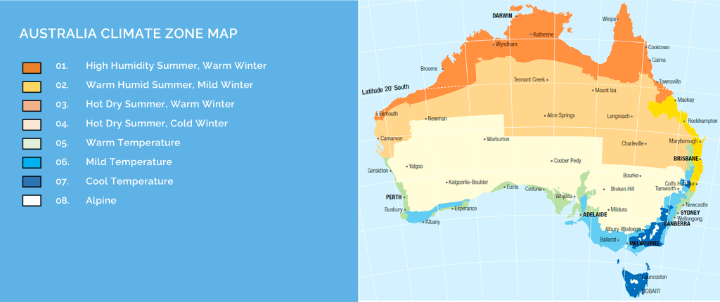 Australia has 7 varied climate categories (per the image above) and each of them requires a specific approach to greener housing. Melbourne is in a mild-temperate climate with four distinct seasons. Summer and winter exceed the human comfort range whilst spring and autumn are ideal for human comfort. The main aims in a mild-temperate zone are to reduce the need for cooling in summer and especially to reduce the need for heating in winter. Happily, this zone type offers good cost-effective opportunities to achieve energy-efficient outcomes.